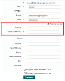 - сменить пароль, при выборе соответствующего пункта, появятся поля, в которые нужно внести новый пароль: