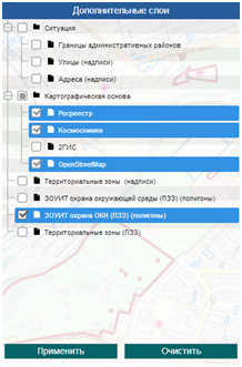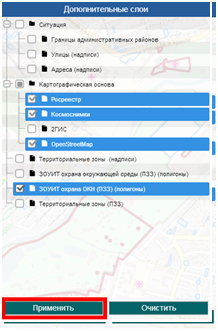 Примечание. Чтобы вернуться к слоям по умолчанию, которые выбраны Администратором, нужно нажать на кнопку «Очистить», а затем кнопку «Применить».