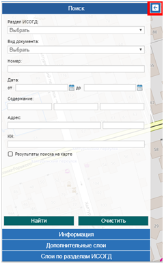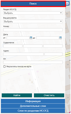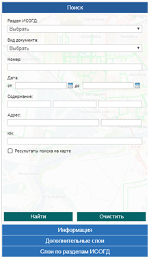 Далее откроется панель настроек, состоящая из 4 вкладок: «Поиск», «Информация», «Дополнительные слои», «Слои по разделам ИСОГД»: