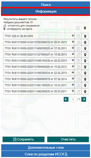 Вкладка «Информация» служит для отображения информации о выделенных или найденных объектах. Данные выводятся в постраничном представлении по 10 записей на странице. Если в окне «Поиска» был отмечен пункт «Результаты на карте», то в окне «Информации» все документы будут отмечены метками