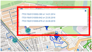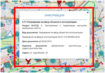 На портале существует возможность выделять объекты, для получения более подробной информации по ним. Для этого должны быть подключены соответствующие слои на вкладке «Слои по разделам ИСОГД».