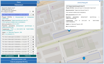 - просмотреть результат: найденные объекты будут отмечены на карте маркерами, а список связанных с ними документов, откроется на вкладке Информация;